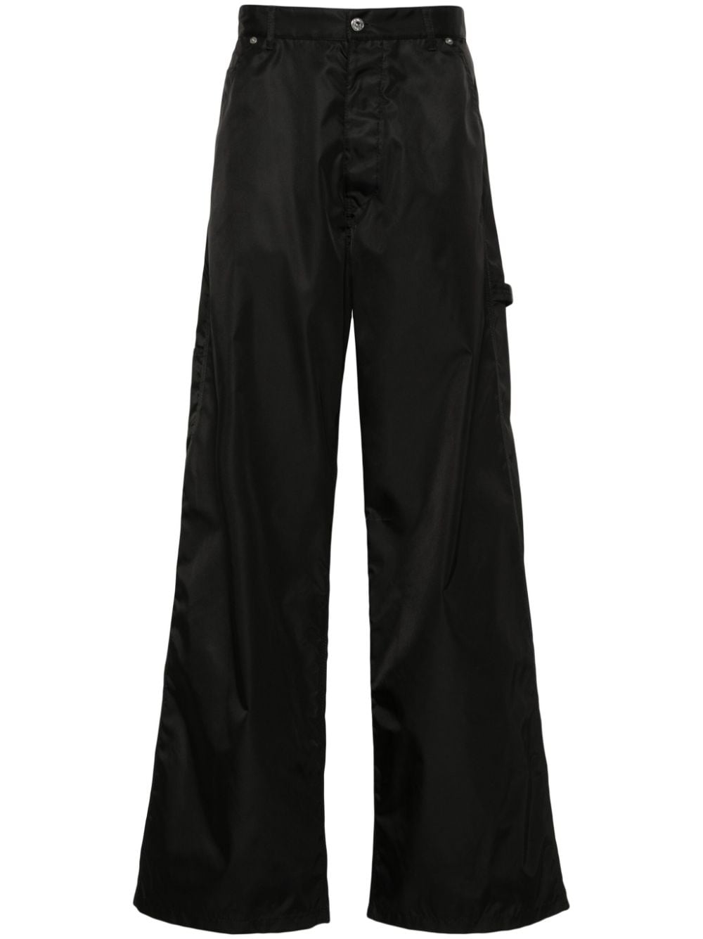 Black recycled polyamide blend taffeta belt loops two diagonal pockets to the sides side patch pocket two rear patch pockets tool loop signature arrows motif embroidered to the rear wide leg concealed fly and button fastening this item is made from at least 50% recycled or upcycled materials. for recycled synthetic clothing products, we highly recommend using a microfibre-catching washing bag to ensure that no microplastics that can pollute water are released in the process. learn more about what makes a product conscious on our conscious criteria page over carpenter nylon carpenter trousers size and fit - this piece fits true to size. we recommend you get your regular size. model is 1,84m / 6ft 1in wearing size 48 (it)