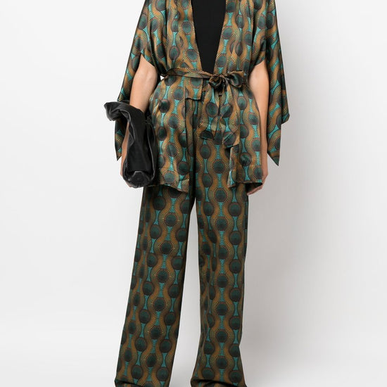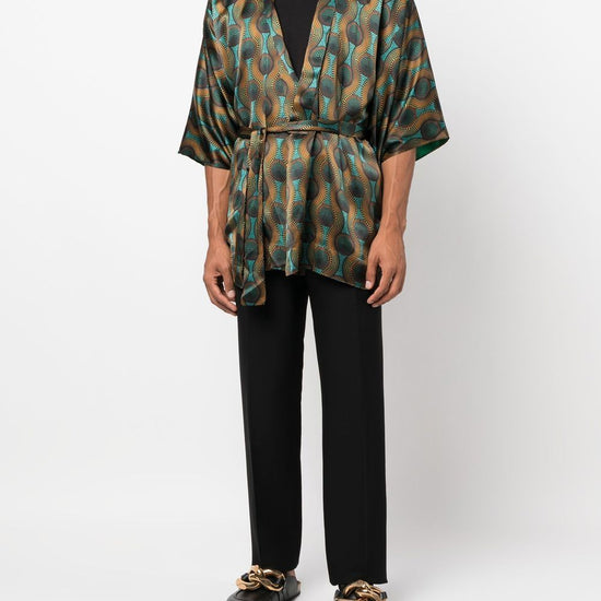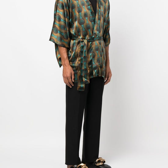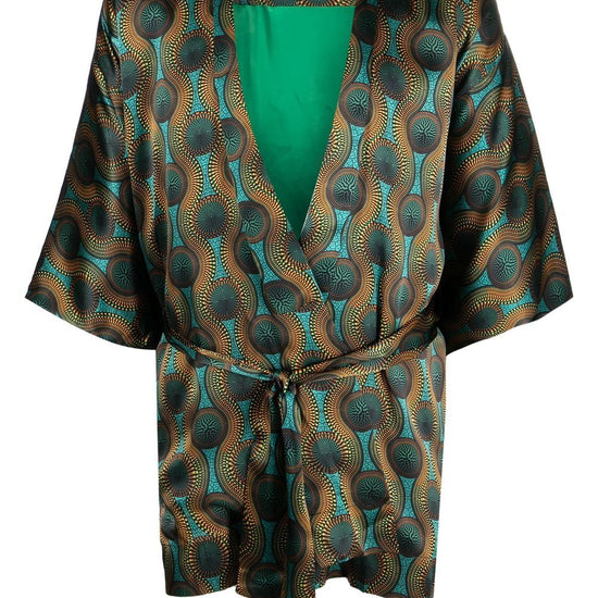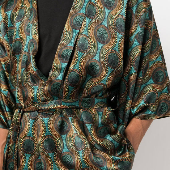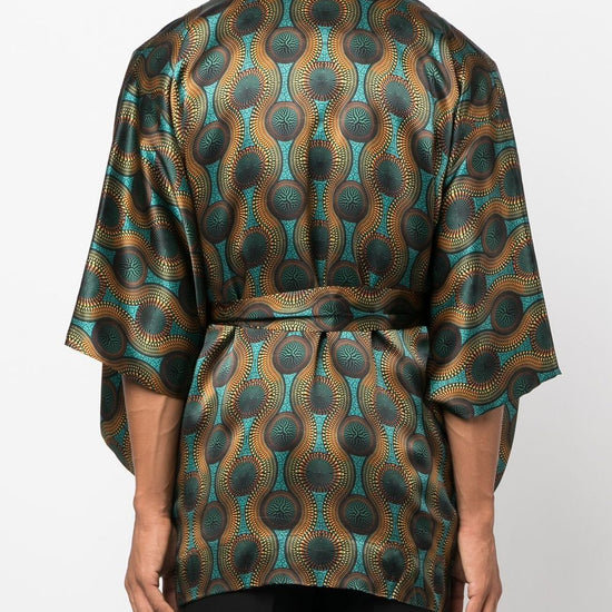 Short geometric-print tie-waist jacket from ozwald boateng featuring orange, multicolour, silk, geometric-pattern print, open front, short sleeves, self-tie fastening and belted waist. printed silk short kimono size and fit - this piece fits true to size. we recommend you get your regular size. model is 1,84m / 6ft 1in wearing size m