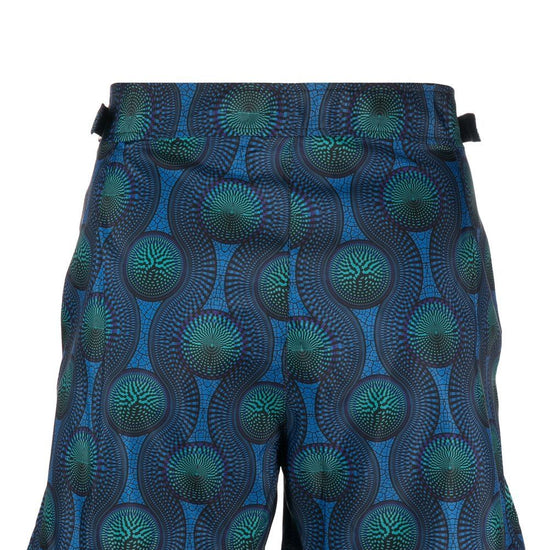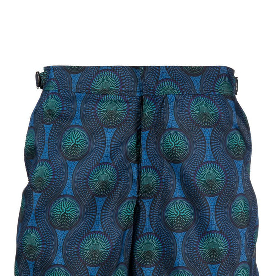Mosaic-print swim shorts from ozwald boateng featuring side buckle fastening, straight leg, knee-length, blue and mosaic print. be mindful to try on swimwear over your own garments.. printed swim shorts size and fit - this piece fits true to size. we recommend you get your regular size. model is 1,84m / 6ft 1in wearing size 32 (waist cm)