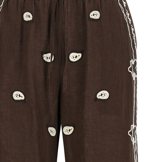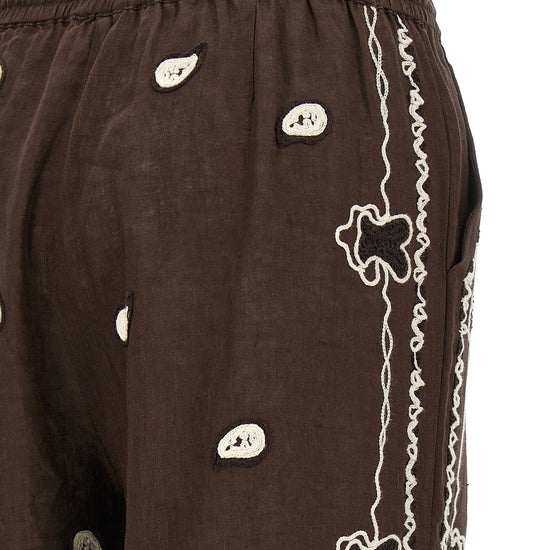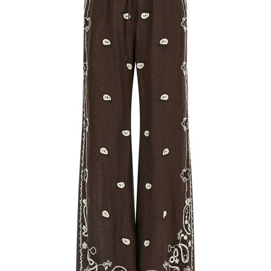 'beach26' linen pants with all-over embroidery, slightly flared wide leg, drawstring elastic waistband, pockets. size and fit - true to size fit