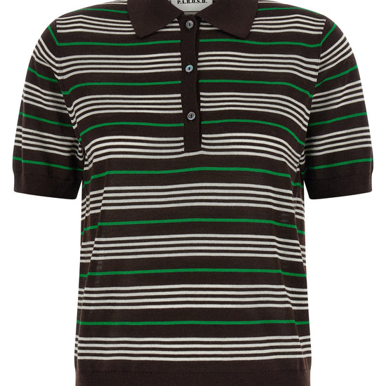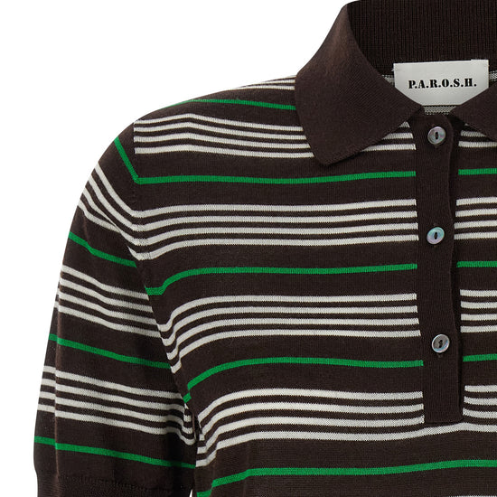 'listripes' striped wool, silk and light cashmere blend polo shirt with collar and buttons, short sleeves with cuffs, and headband. size and fit - true to size fit