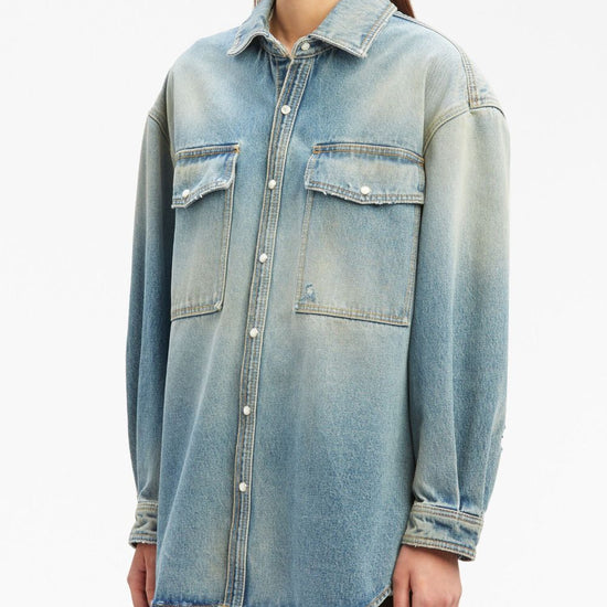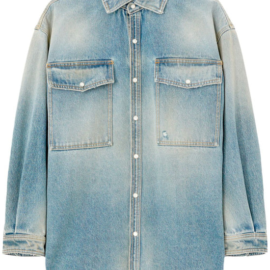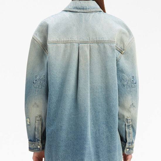 Embroidered-design denim shirt from palm angels featuring blue, cotton, embroidered design, distressed finish, classic collar, long sleeves and front button fastening. overshirt cargo cotton overshirt size and fit - this piece fits true to size. we recommend you get your regular size. model is 1,75m / 5ft 8in wearing size s