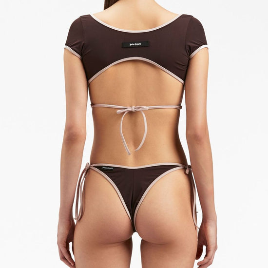 Cap-sleeve wrap bikini top from palm angels featuring brown, light pink, stretch-design, contrasting border, logo patch to the rear, wrap design, rear tie fastening, cap sleeves and cropped. cap-sleeves bikini top size and fit - this piece fits true to size. we recommend you get your regular size. model is 1,75m / 5ft 8in wearing size s
