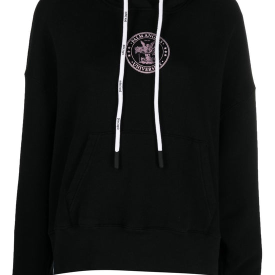 College logo-print hoodie from palm angels featuring black, cotton, drawstring hood, logo print to the front, long sleeves, ribbed trim and straight hem. college classic college classic hoodie size and fit - this piece fits true to size. we recommend you get your regular size. model is 1,75m / 5ft 8in wearing size s