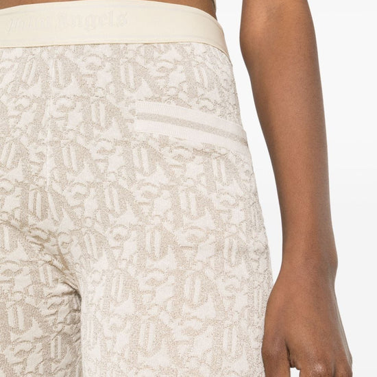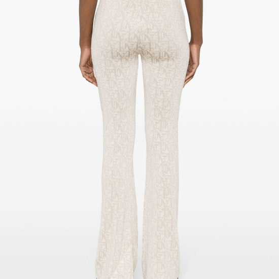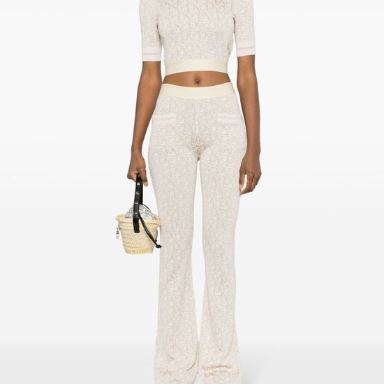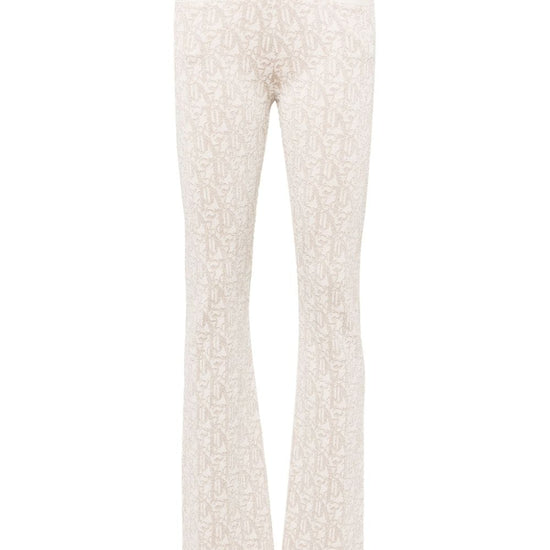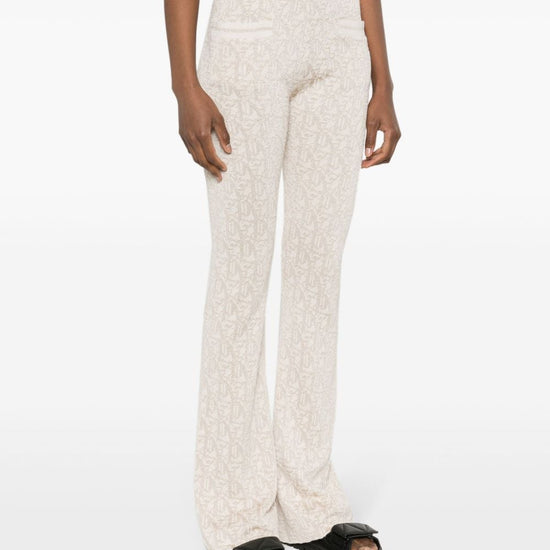 Light beige, gold-tone knitted construction metallic threading monogram jacquard striped elasticated logo waistband two front welt pockets flared unlined pull-on style monogram jacquard knit trousers size and fit - this piece fits true to size. we recommend you get your regular size. model is 1,75m / 5ft 8in wearing size s