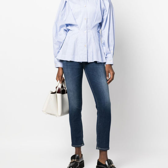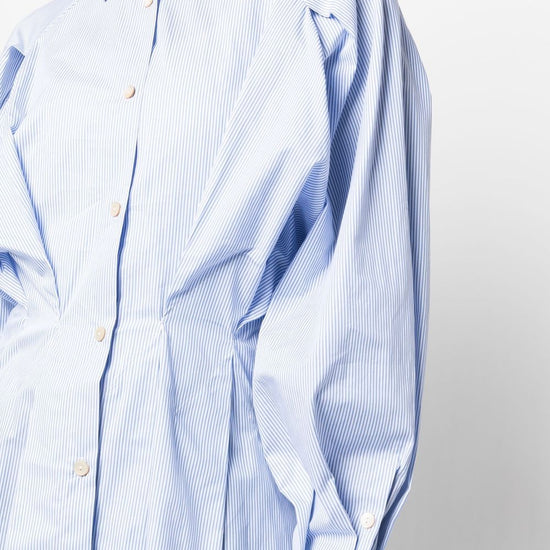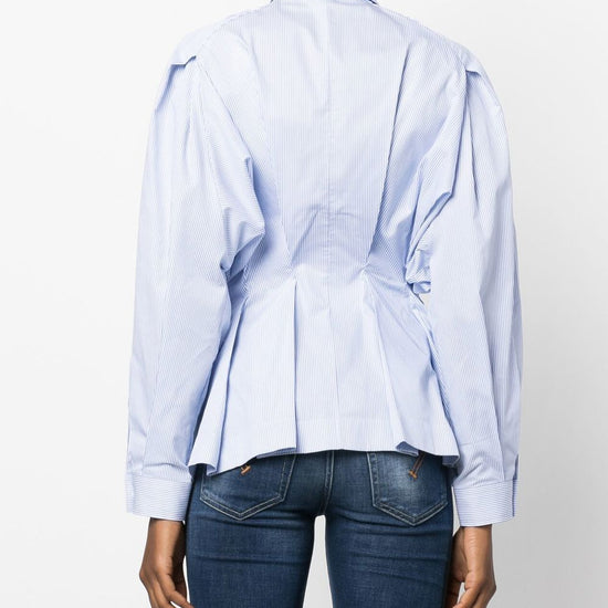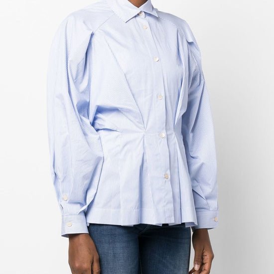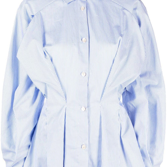 Gathered-waist cotton shirt from palmer//harding featuring pastel blue, cotton, gathered detailing, classic collar, front button fastening, long sleeves, buttoned cuffs, pleat detailing and straight hem. striped cotton shirt size and fit - this piece fits true to size. we recommend you get your regular size. model is 1,75m / 5ft 8in wearing size 8 (uk)