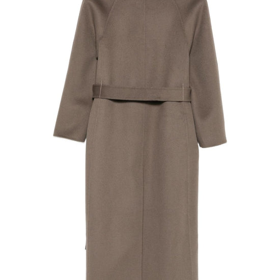 Taupe wrap fastening belted waist long sleeves notched lapel raglan sleeves paola wool coat size and fit - . .