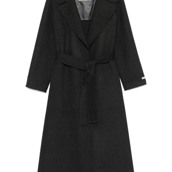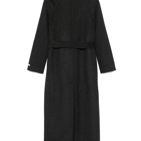 Anthracite grey wool blend felted mélange effect self-tie fastening raised seam detail notched lapels long raglan sleeves mini logo tag two side inset pockets detachable waist belt central rear vent partial lining straight hem  paola wool belted coat