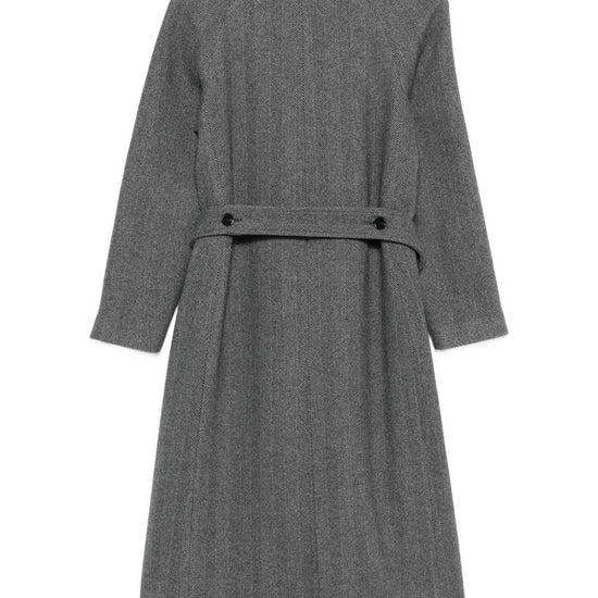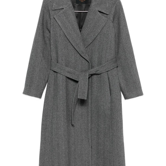 Grey herringbone weave belted waist notched lapel long sleeves concealed fastening paola wool coat