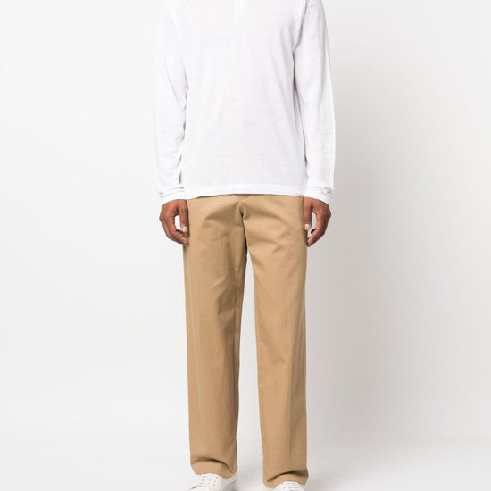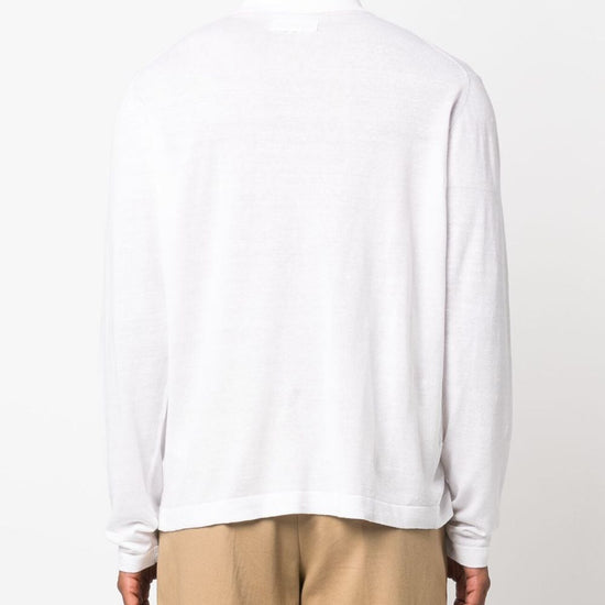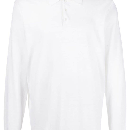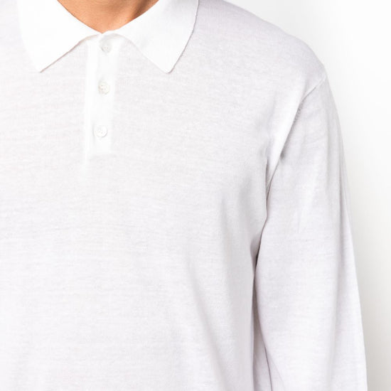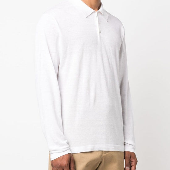 Long-sleeved cotton-linen polo shirt from paltò featuring front button placket, white, cotton, linen, polo collar, long sleeves and straight hem. this item contains at least 50% materials which are certified or widely recognised as having a lower environmental impact through production and/or manufacturing processes that reduce water consumption and the use of harmful chemicals, or re-use by-products of the production process.. learn more about what makes a product conscious on our conscious criteria page. m/l long sleeve linen blend shirt size and fit - this piece fits true to size. we recommend you get your regular size. model is 1,84m / 6ft 1in wearing size m