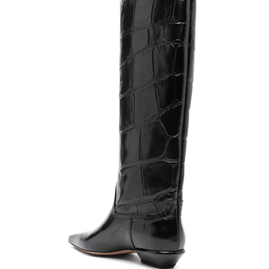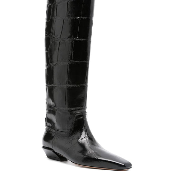 Black calf leather embossed crocodile effect square toe low block heel leather and rubber sole bettina leather boots size and fit - heel 3 cm