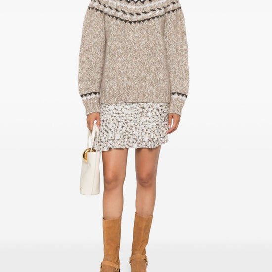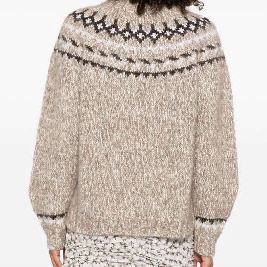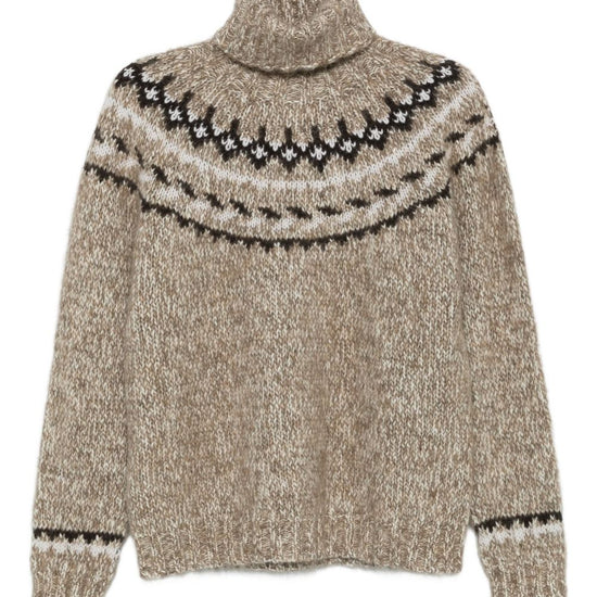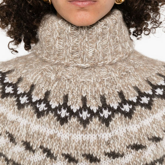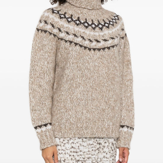Beige high neck fair isle pattern long sleeves ribbed cuffs and hem wool turtle-neck jumper