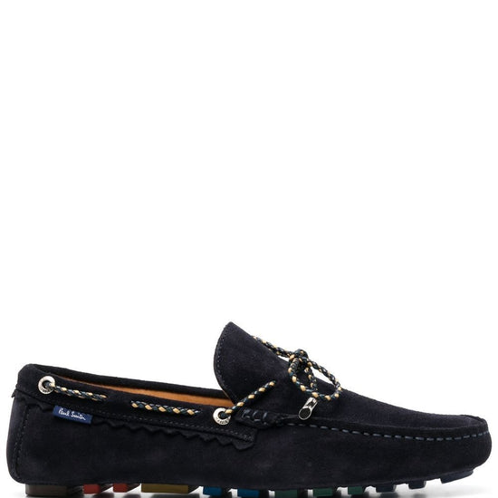 Rope-detail suede loafers from ps paul smith featuring apron toe, rope detailing, mini logo tag, whipstitch detailing, round toe, slip-on style, branded leather insole, rubber lug sole and calf leather/calf suede. suede leather loafers size and fit - heel 0,4 in / 1 cm