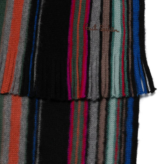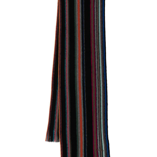 Black/multicolour merino wool ribbed knit vertical stripe pattern fringed edge rectangle shape wraparound style striped scarf size and fit - length: 180.0 centimetres. width: 35.0 centimetres.