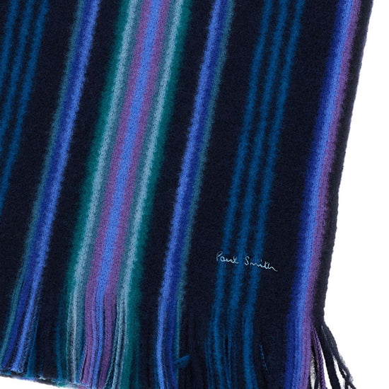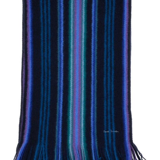 Blue signature stripe pattern wool material fringed edges striped scarf