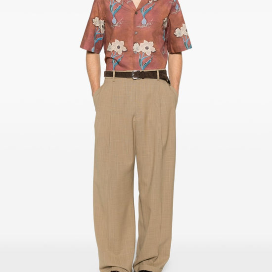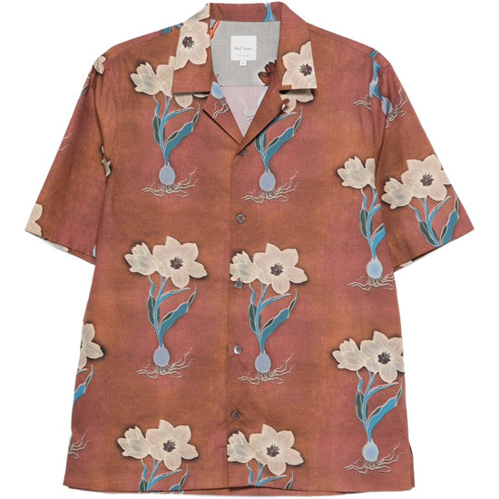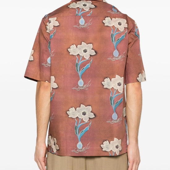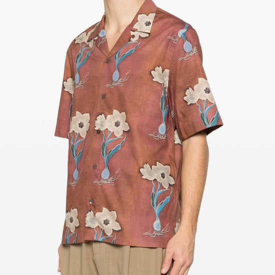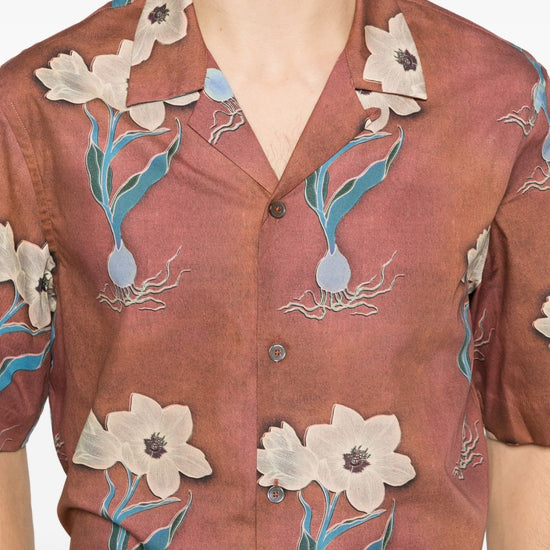 Brown floral print short sleeves button fastening camp collar front button closure printed shirt