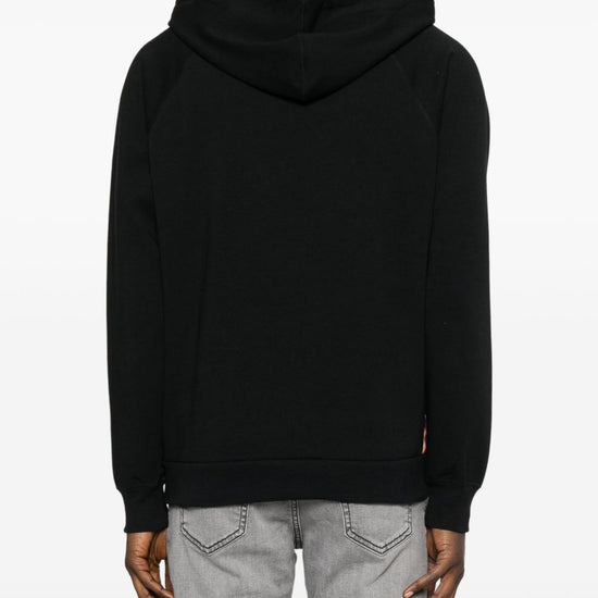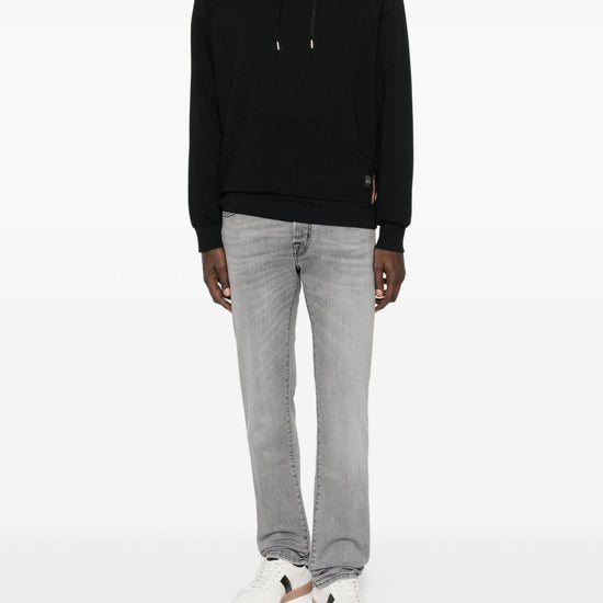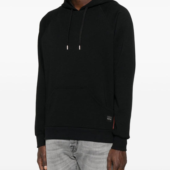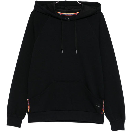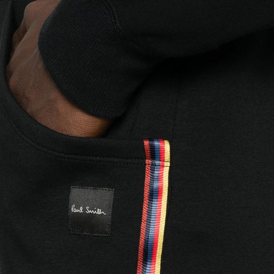 Black drawstring hood long sleeves pouch pocket striped side panels signature stripe hoodie