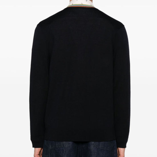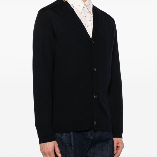 Midnight blue front button fastening ribbed cuffs and hem v-neck long sleeves wool cardigan