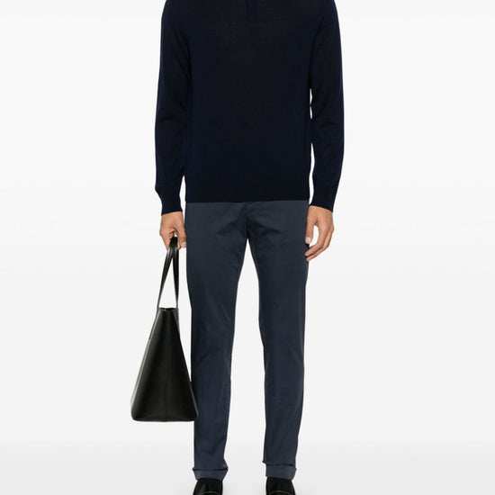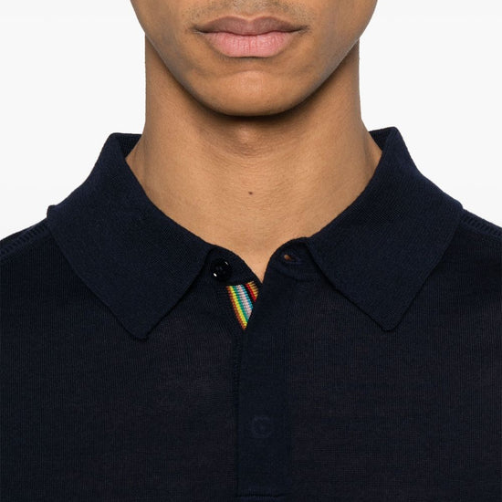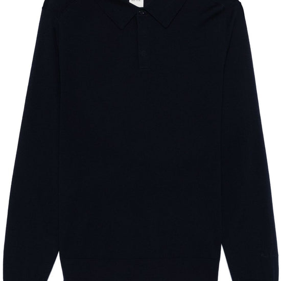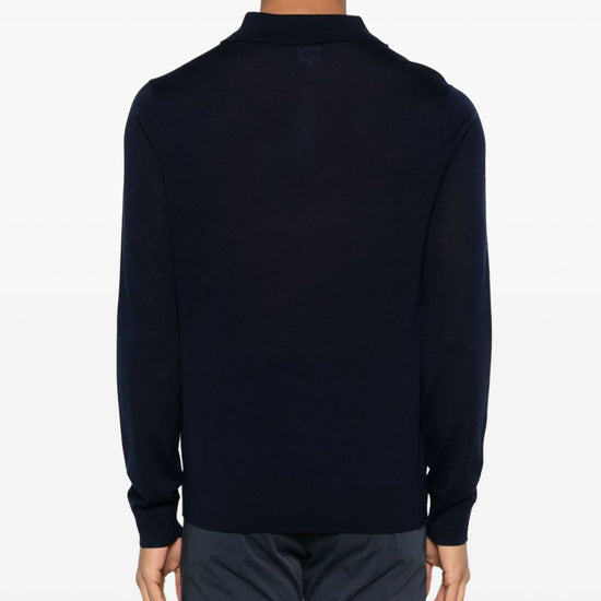 Midnight blue short front button fastening ribbed cuffs and hem polo collar wool crewneck sweater