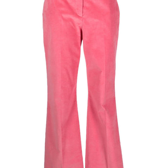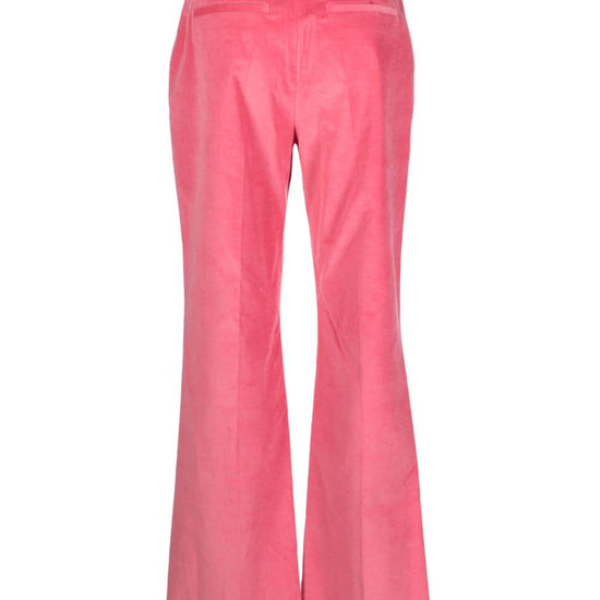 Flamingo pink stretch-cotton velvet finish pressed crease belt loops concealed front button and zip fastening straight leg high-waisted two side inset pockets two rear welt pockets flare-leg trousers size and fit - this piece fits true to size. we recommend you get your regular size. model is 1,75m / 5ft 8in wearing size 40 (it)