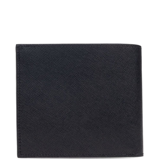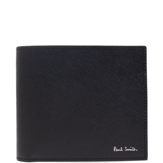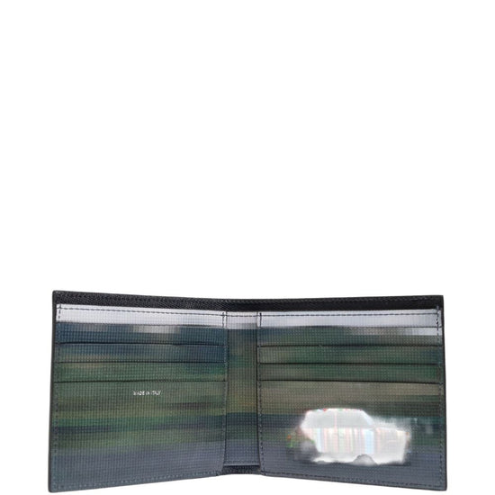 Black internal card slots note compartment bi-fold design logo stamp to the front leather bifold wallet size and fit - length 10.9 cm. width 9.3 cm.