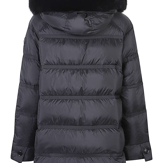 Black, quilted design, fur trim, hooded neckline, zipper closure, side pockets. takan midi down jacket size and fit - .