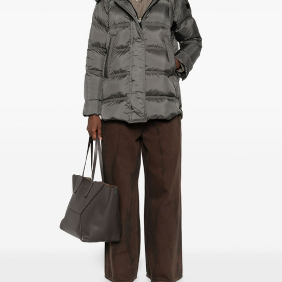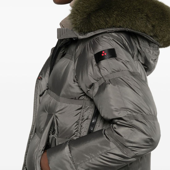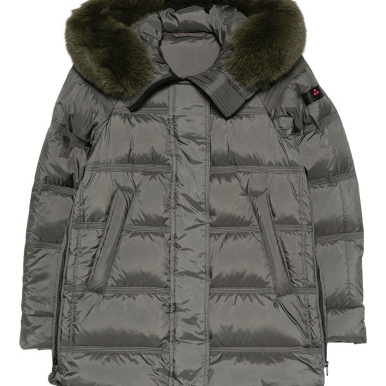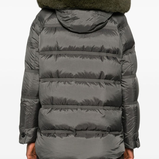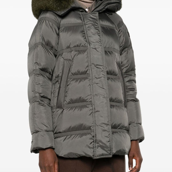 Green quilted design fur trim hooded neckline zip fastening side pockets hooded midi down jacket size and fit - .
