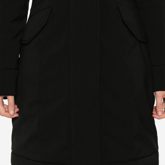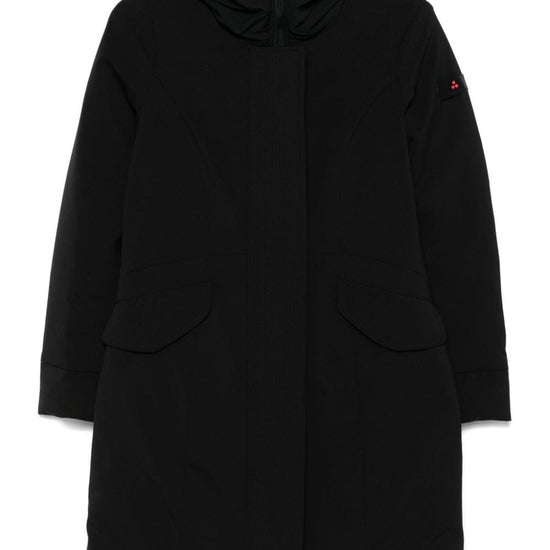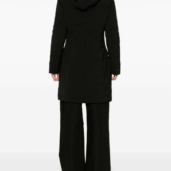 Black twill weave duck down padded design windproof front press-stud and zip fastening funnel neck classic hood long sleeves buttoned cuffs two front flap pockets quilted lining straight hem emin tj nylon parka coat size and fit - this piece fits true to size. we recommend you get your regular size. model is 1,75m / 5ft 8in wearing size 40 (it)
