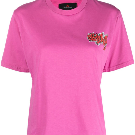 Chest graffiti-print t-shirt from peuterey featuring graffiti print, peony pink, cotton, round neck, short sleeves and straight hem. axie yg print logo cotton t-shirt