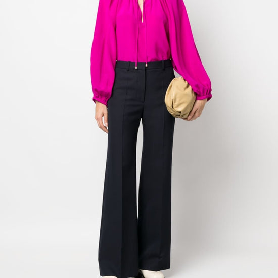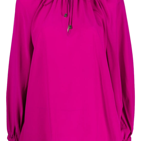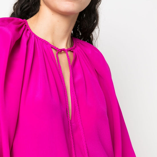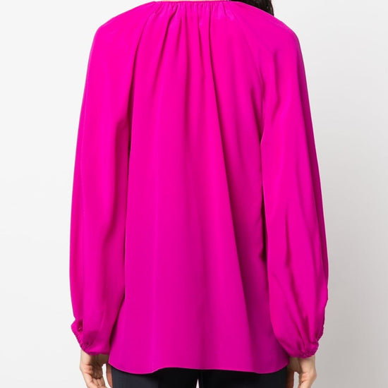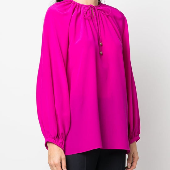 Self-tie silk blouse from phaeonia featuring fuchsia pink, silk, self-tie fastening, long puff sleeves, straight hem and keyhole neck. blusa, laccio al collo, m/l, polsini elasticizzati anita long sleeves blouse size and fit - this piece fits true to size. we recommend you get your regular size. model is 1,75m / 5ft 8in wearing size 40 (it)