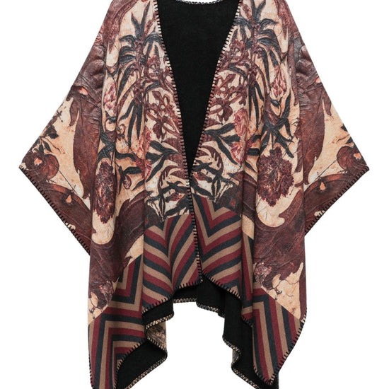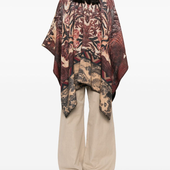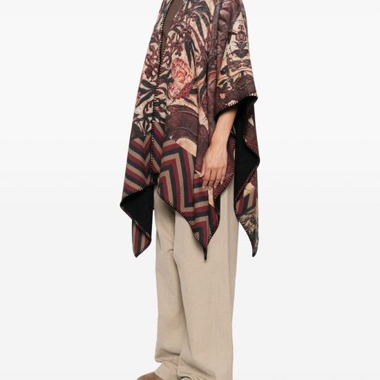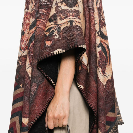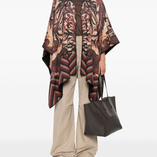 Brown zig-zag pattern floral print wool material stitched trim cape silhouette wool printed poncho