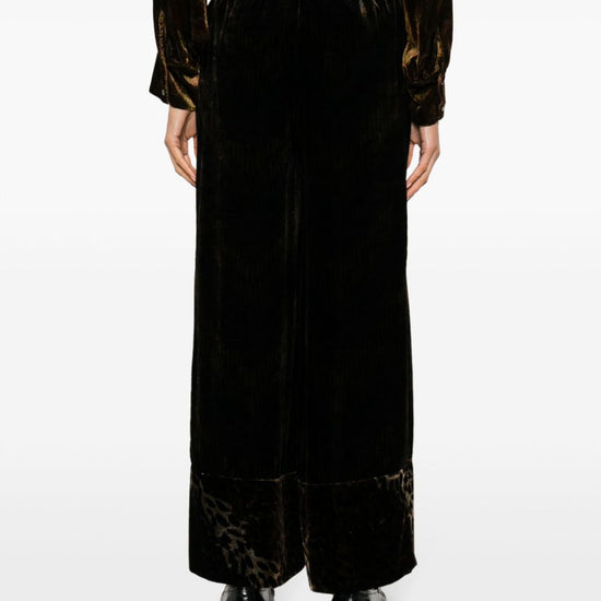 Dark green velvet leopard print wide leg elasticated waistband two side inset pockets silk printed trousers