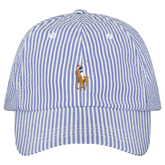 elevate your casual look with the polo ralph lauren cotton sport baseball cap in blue/ white stripe. crafted from breathable cotton, this sporty take on a classic features a blue striped design and is finished with polo’s signature embroidered pony. a timeless accessory that brings effortless style to any laid-back outfit.