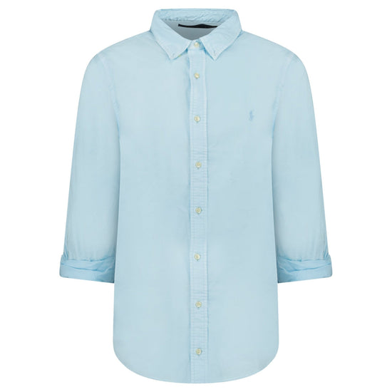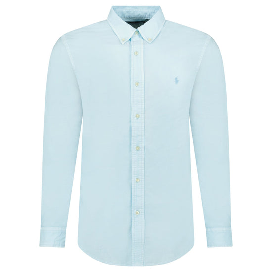 elevate your smart-casual wardrobe with the ralph lauren custom fit long sleeve sport shirt in sky. crafted from 100% cotton and garment-dyed for a rich, lived-in tone, this oxford shirt blends traditional style with a fresh seasonal colour. the custom fit delivers a tailored silhouette that balances sharp structure with everyday comfort.
