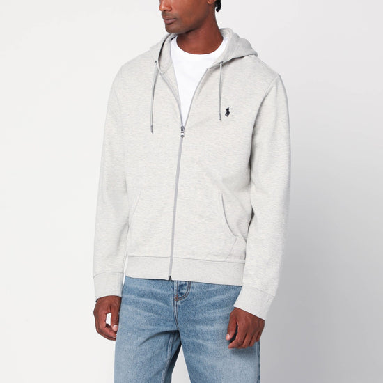 Light grey cotton blend hoodie by polo ralph lauren, featuring a drawstring hood, front zip closure, long sleeves, two front pockets, logo embroidery on the chest, and ribbed edges. size and fit - model wears size l model measurements: height: 187 cm chest: 102 cm waist: 76 cm hips: 92 cm