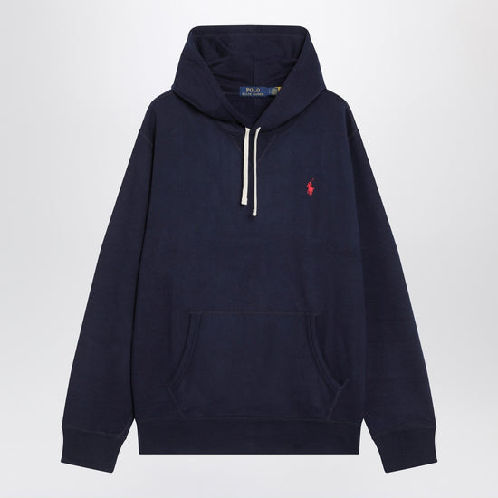 Polo ralph lauren navy blue cotton-blend hoodie with drawstring hood, long sleeves, kangaroo pocket, contrast embroidered logo on the chest, and ribbed trims. size and fit - model wears size l model measurements: height: 185 cm chest: 86 cm waist: 72 cm hips: 93 cm