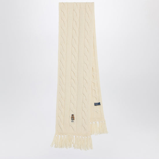 Polo ralph lauren scarf in cream cable knit wool featuring a fringed border and front polo bear embroidery.