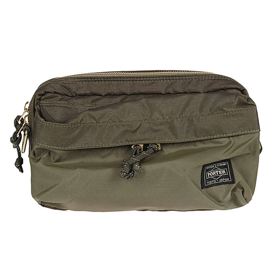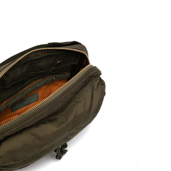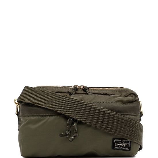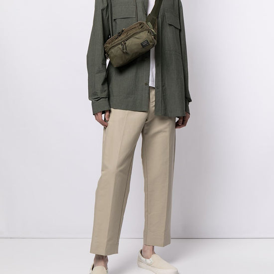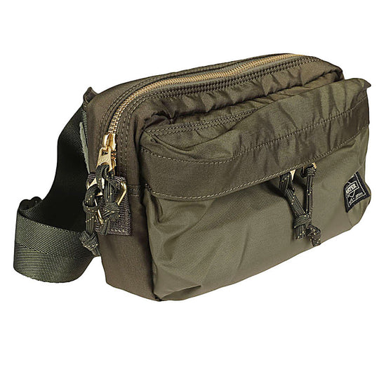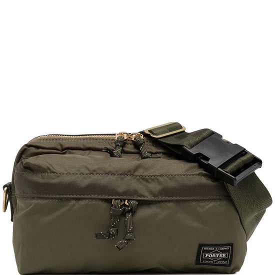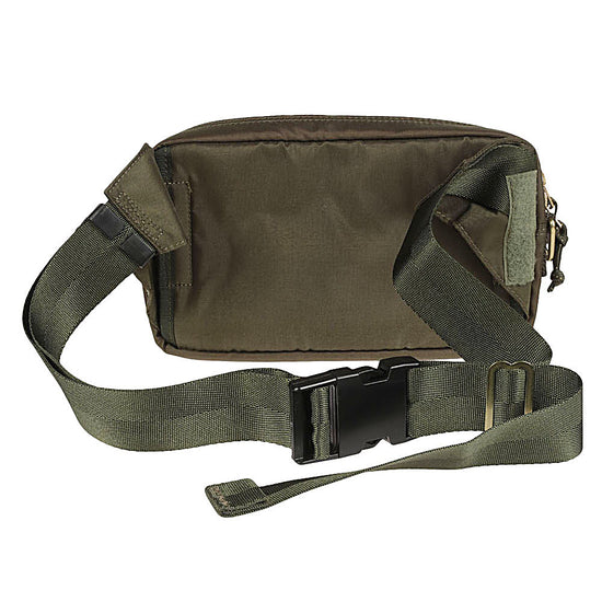 Olive green logo patch to the front rectangle body front zip fastening pockets top zip fastening adjustable detachable shoulder strap force 2way nylon beltbag
