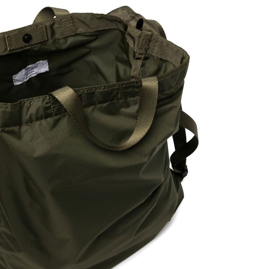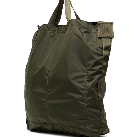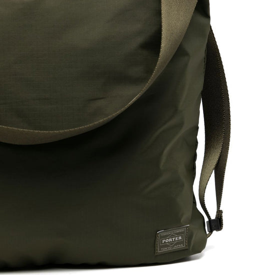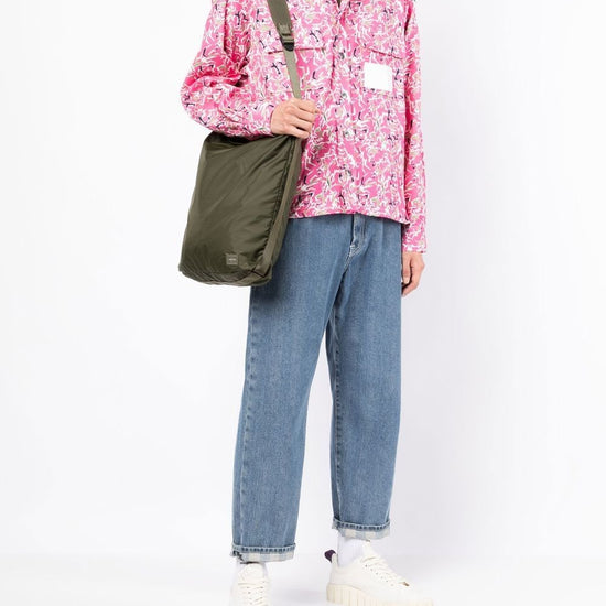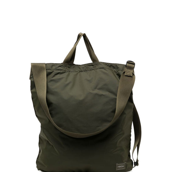 Olive green logo patch to the front rectangle shape two top handles long top handle main compartment flwx 2way nylon shoulder bag