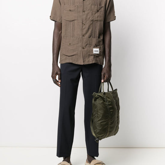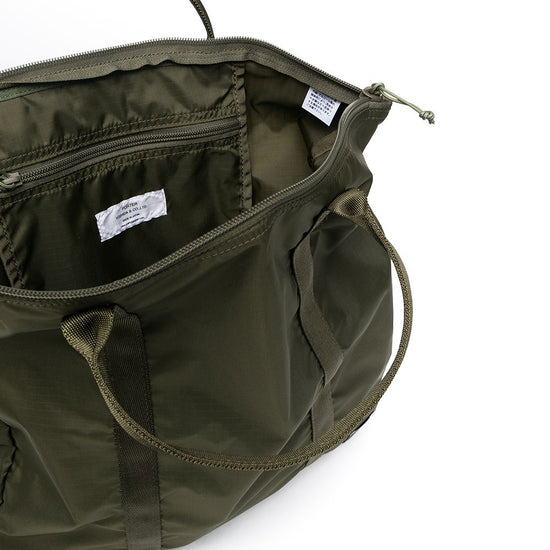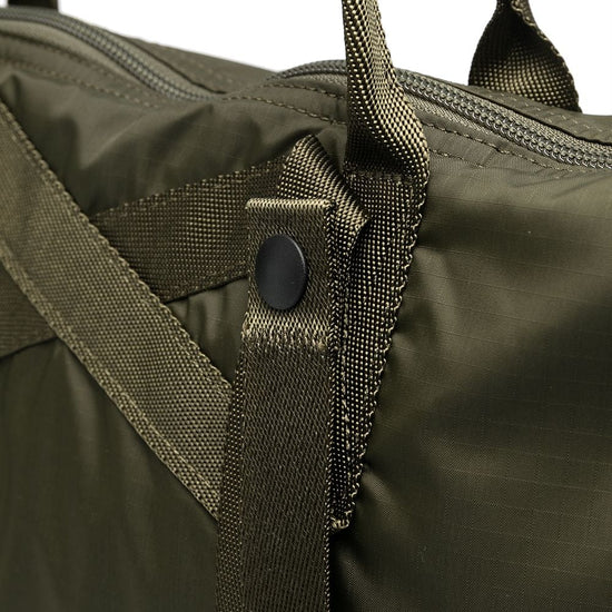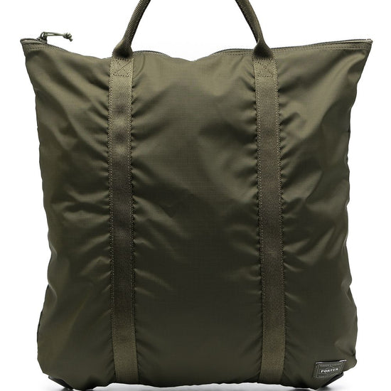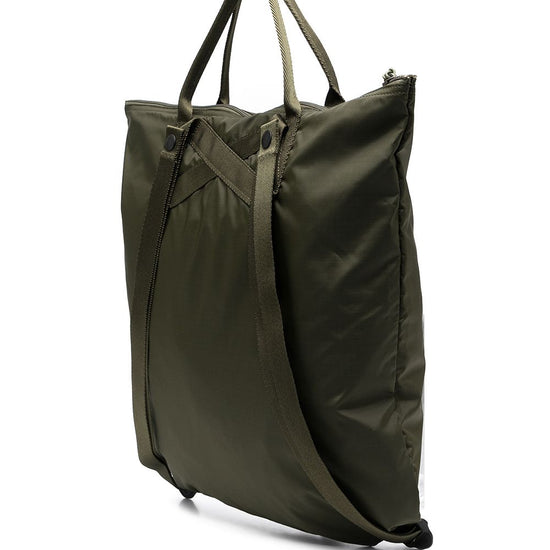Olive green logo patch to the side two top handles top zip fastening crossover strap detail detachable shoulder straps internal zip-fastening pocket main compartment flex 2way nylon tote bag