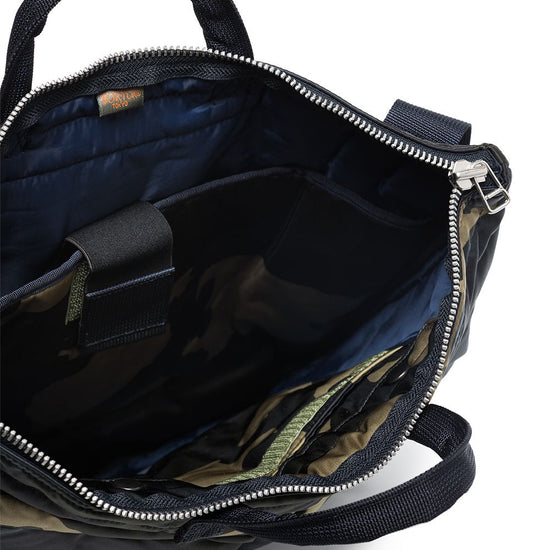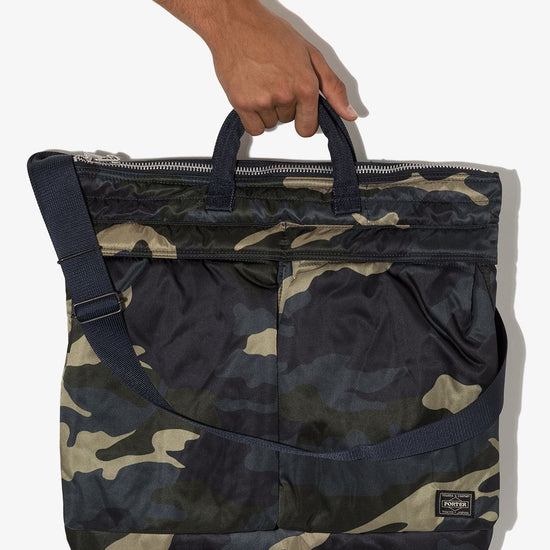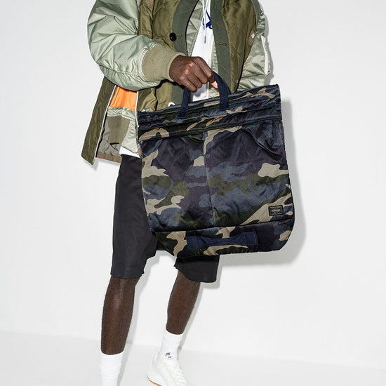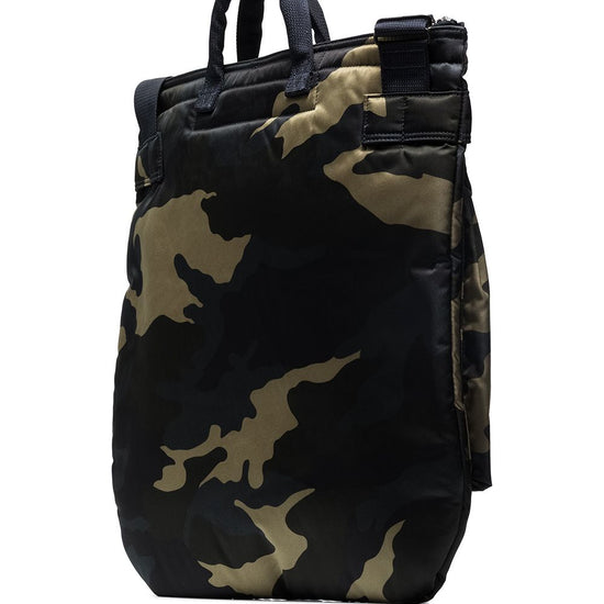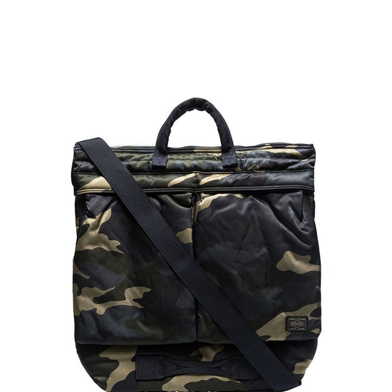 Kaki green camouflage print logo patch to the front top zip fastening single shoulder strap two rounded top handles main compartment two front pouch pockets counter shade helmet bag