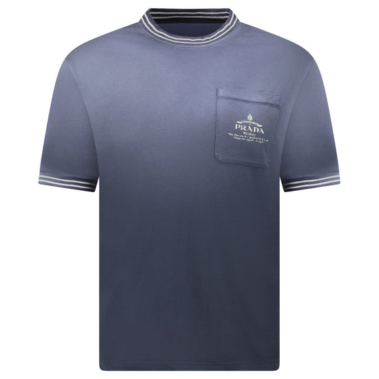 the prada logo old effect t-shirt in blue delivers a contemporary twist on a wardrobe staple. made in italy from soft cotton, it features a faded, vintage-inspired wash for a unique worn-in look. the chest pocket is detailed with prada’s printed logo, adding subtle brand identity while maintaining a relaxed aesthetic. completed with striped ribbed trims at the collar and sleeves, this tee balances casual comfort with luxury finishings.