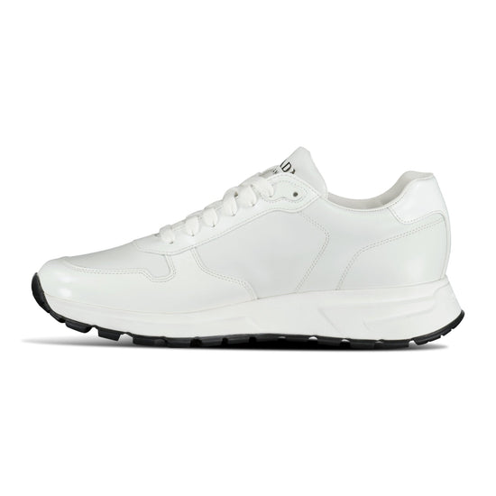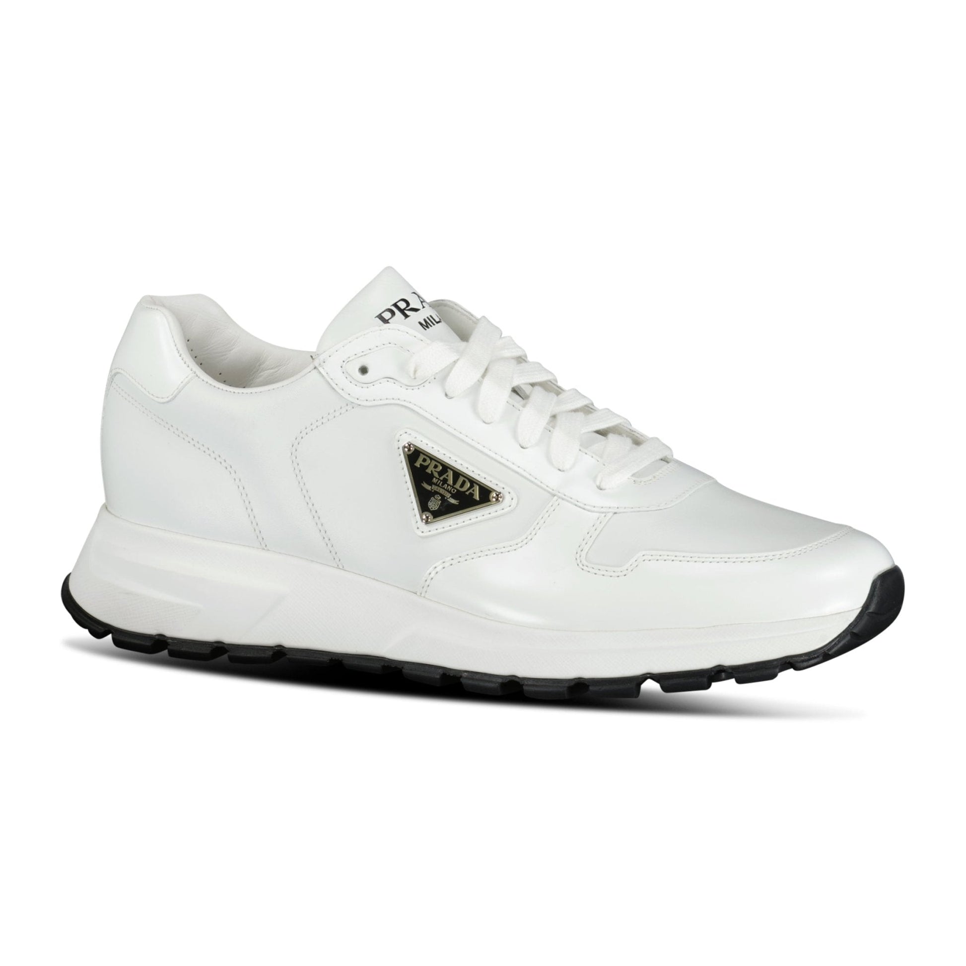 the prada re-nylon triangle logo trainers in white are the perfect combination of style and function. featuring a sleek and modern design, these trainers are made with durable and water-resistant nylon material to withstand harsh weather conditions. the unique triangle logo adds a touch of luxury to the overall look. the shoes are designed for comfort and durability with a thick rubber sole and cushioned footbed, making them ideal for any active lifestyle. these trainers are perfect for those who appreciate quality and style in their everyday footwear.