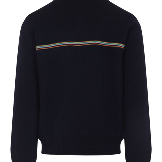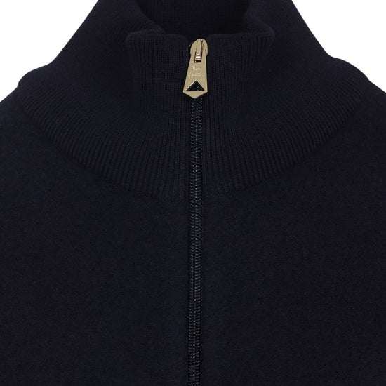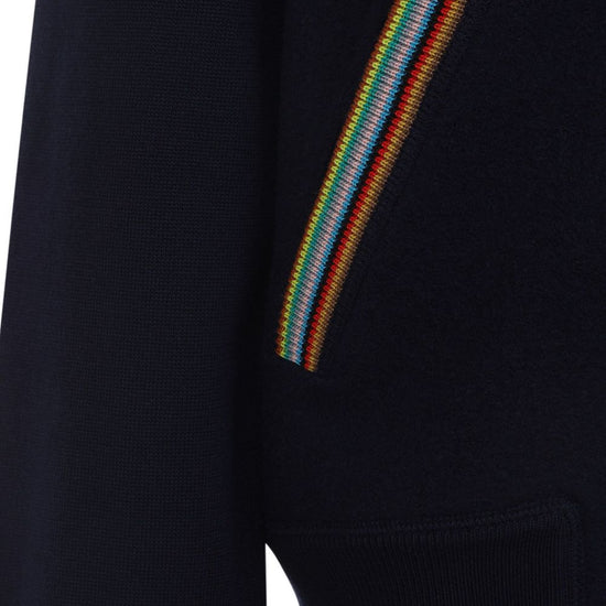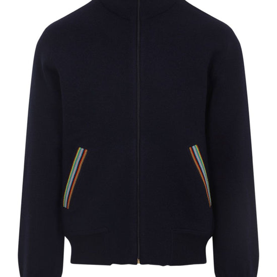 Navy blue zip fastening high neck ribbed cuffs striped detailing wool wool bomber jacket