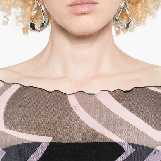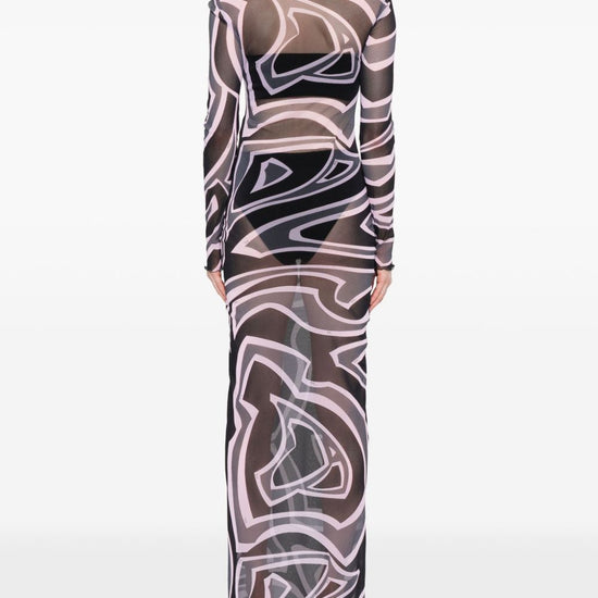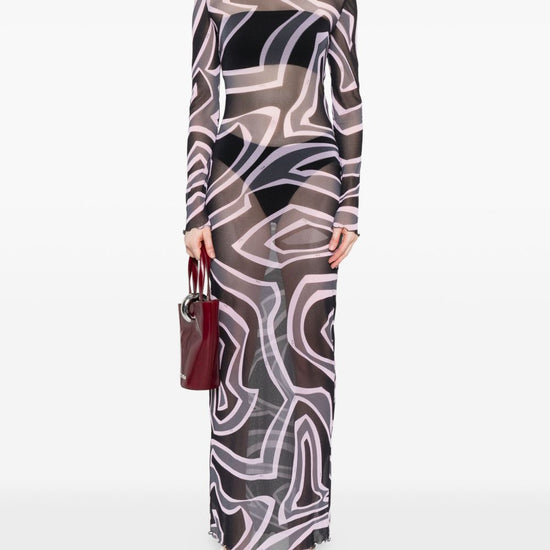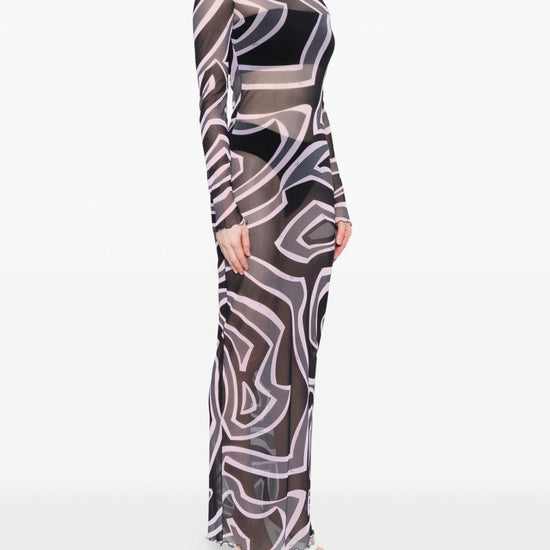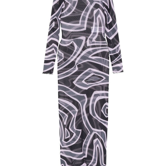 Black and pink abstract print long sleeves boat neck scalloped hem printed maxi dress
