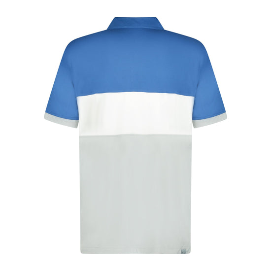 elevate your golf wardrobe with the puma highway polo shirt. featuring a classic button-up design and a cuffed collar, this shirt combines style and functionality. the vibrant colour combination of white, blue, and grey, along with the puma logo on the left chest, makes it a standout choice for any golfer.