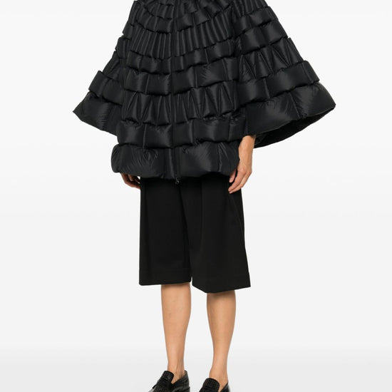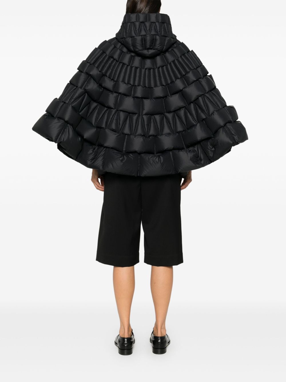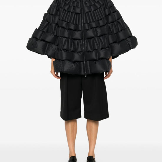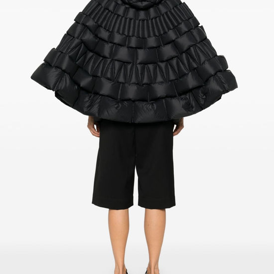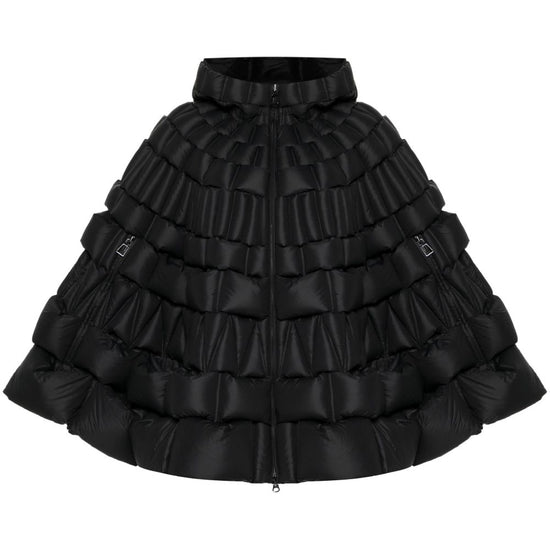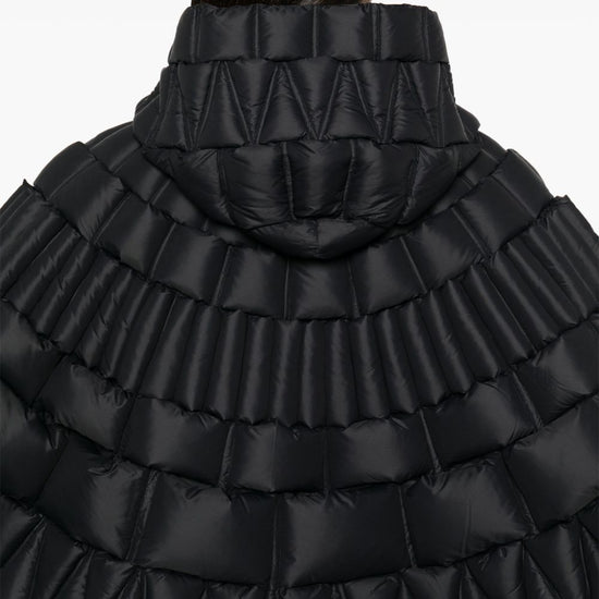 Black goose down padded design 3d basket weave front two-way zip fastening classic hood cape design two side zip-fastening pockets full lining curved hem down cape