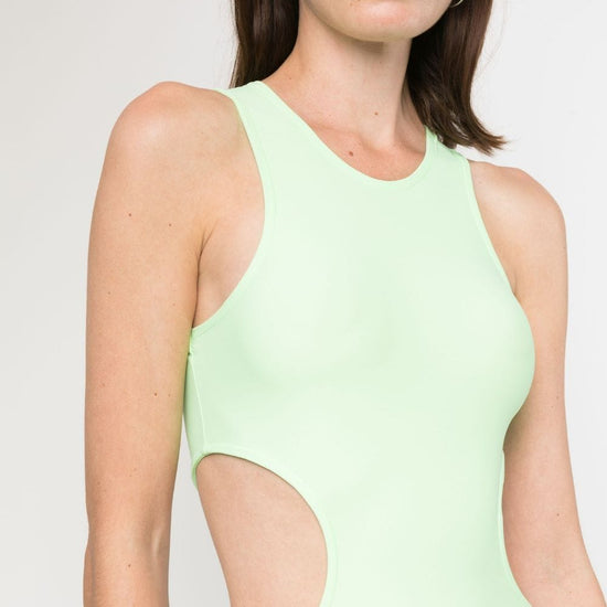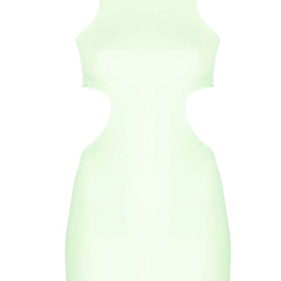 Cut-out sleeveless minidress from reina olga featuring mint green, stretch-design, cut-out detailing, round neck, thin shoulder straps, sleeveless, racerback and thigh-length. cut-out cut-out detail short dress size and fit - this piece fits true to size. we recommend you get your regular size. model is 1,75m / 5ft 8in wearing size 1 (num)