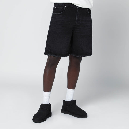 Denim bermuda shorts by represent in black vintage-effect cotton, featuring front zip and button closure, waistband with logo metal detail, and five classic pockets including one back pocket with embroidered logo. size and fit - model wears size 32 model measurements: height: 185 cm chest: 86 cm waist: 72 cm hips: 93 cm
