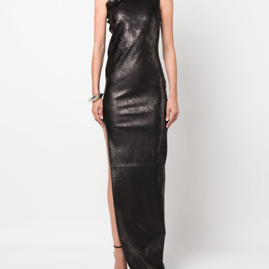 Asymmetric-neck sequinned maxi dress from rick owens featuring jet black, stretch-cotton, matte finish, sequin embellishment, draped panel detail, asymmetric neck, rear zip fastening, single shoulder strap, sleeveless, side slit, asymmetric hem and floor-length. embroidered denim long dress size and fit - this piece fits true to size. we recommend you get your regular size. model is 1,75m / 5ft 8in wearing size 40 (it)